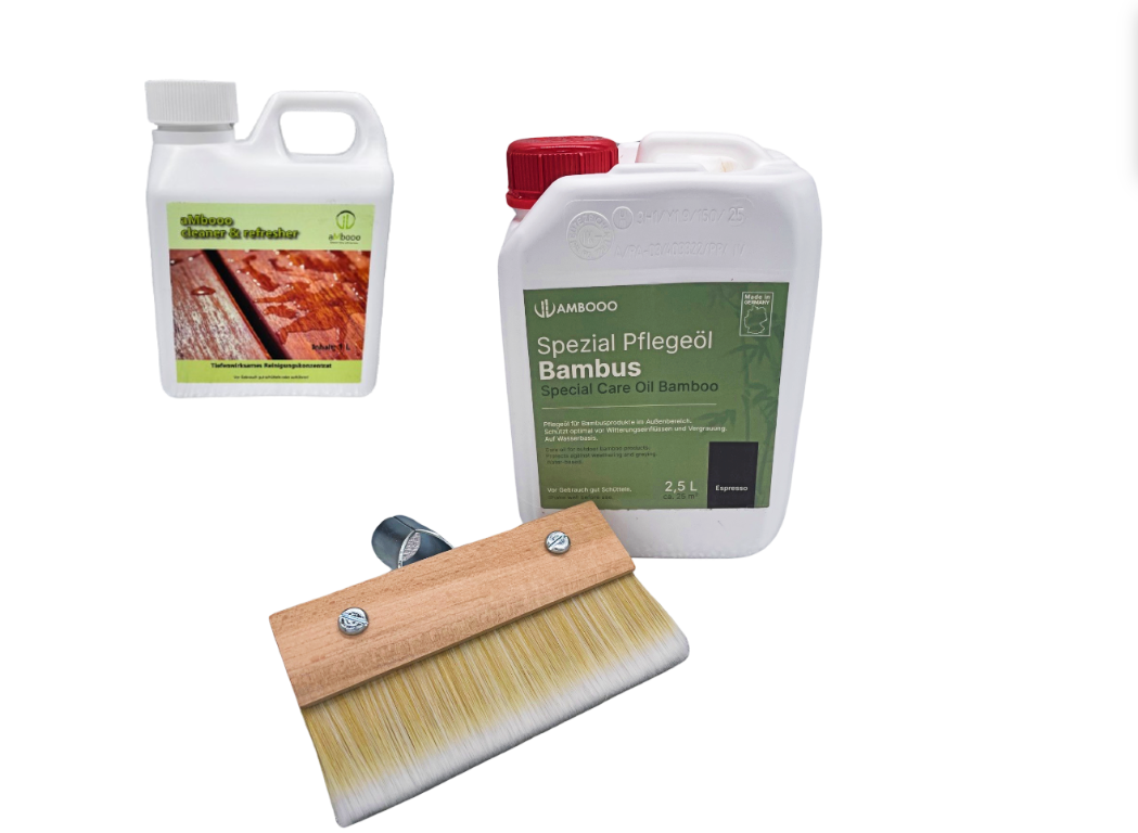 Dieses Set wurde speziell entwickelt, um Terrassendielen aus Bambus oder Holz zu reinigen, zu pflegen und zu schützen, damit sie jahrelang wie neu aussehen. Verleihen Sie Ihrer Terrasse ein strahlendes Aussehen und schützen Sie sie vor den Einflüssen von Wind und Wetter. Mit unserem Terrassendielen-Pflegeset bleibt Ihre Terrasse stets ein Ort zum Wohlfühlen und Entspannen. Bestellen Sie noch heute und genießen Sie Ihre frisch gepflegte Bambusterrasse.