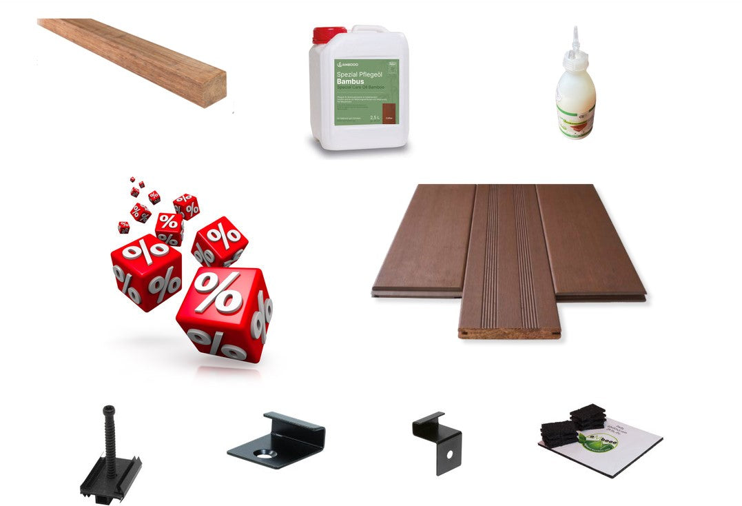 Die im Set enthaltenen Dielen bestehen aus thermisch behandeltem Bambus und zeigen durch ihre dunkle, braune Farbgebung ein elegantes Erscheinungsbild, das sich harmonisch in unterschiedlichste Garten- und Terrassengestaltungen einfügt.